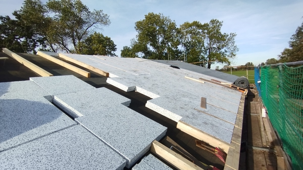 16cm dämmung sorgen dafür, dass es im probenraum warm werden kann und auch bleibt. die arbeiten gehen bei gutem wetter schnell voran - leider ist es oft regnerisch. hinten ist die endgültige oberfläche, eine epdm-folie, zu sehen. sie wird mit dem dämmung verklebt.
