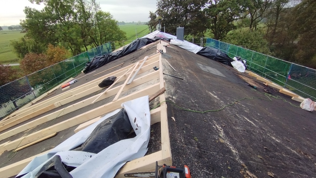 die alte teerpappe ist soweit funktionstüchtig, dass sie mit einigen reparaturmaßnahmen als neue dampfbremse funktioniert. links werden die sparren aufgedoppelt, damit später die schienen für die pv-anlage und die solarthermie montiert werden können.