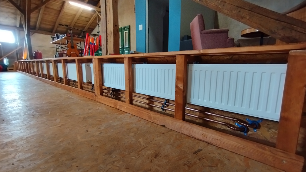 fast 12 meter heizkörper sind installiert. zur sicherheit mit einem hübschen holzrahmen umbaut und funktonieren einwandfrei - jetzt ist Dein Probenraum endlich beheizbar und auch im winter nutzbar.