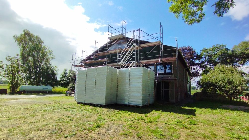 das erste gerüst ist aufgestellt und wir freuen uns nun auf die ersten, größeren arbeiten: der einbau der fensterfront und die energetische optimierung des giebels.