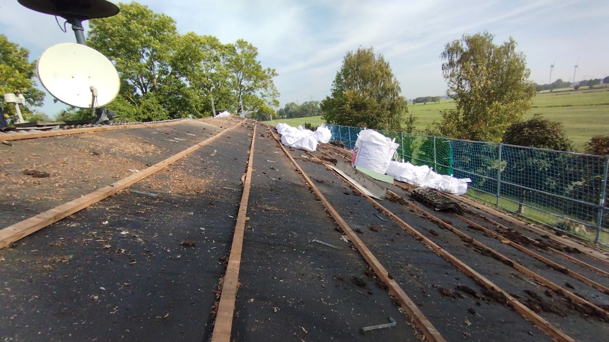 fazit: in einer nacht- und nebelaktion habe ich mit den nachbarn das komplette Dach provisorisch mit silofolie abgedeckt und so den probenraum und das wohnhaus vor wasserschäden geschützt.