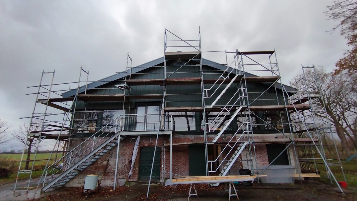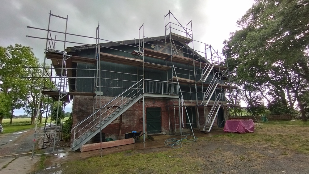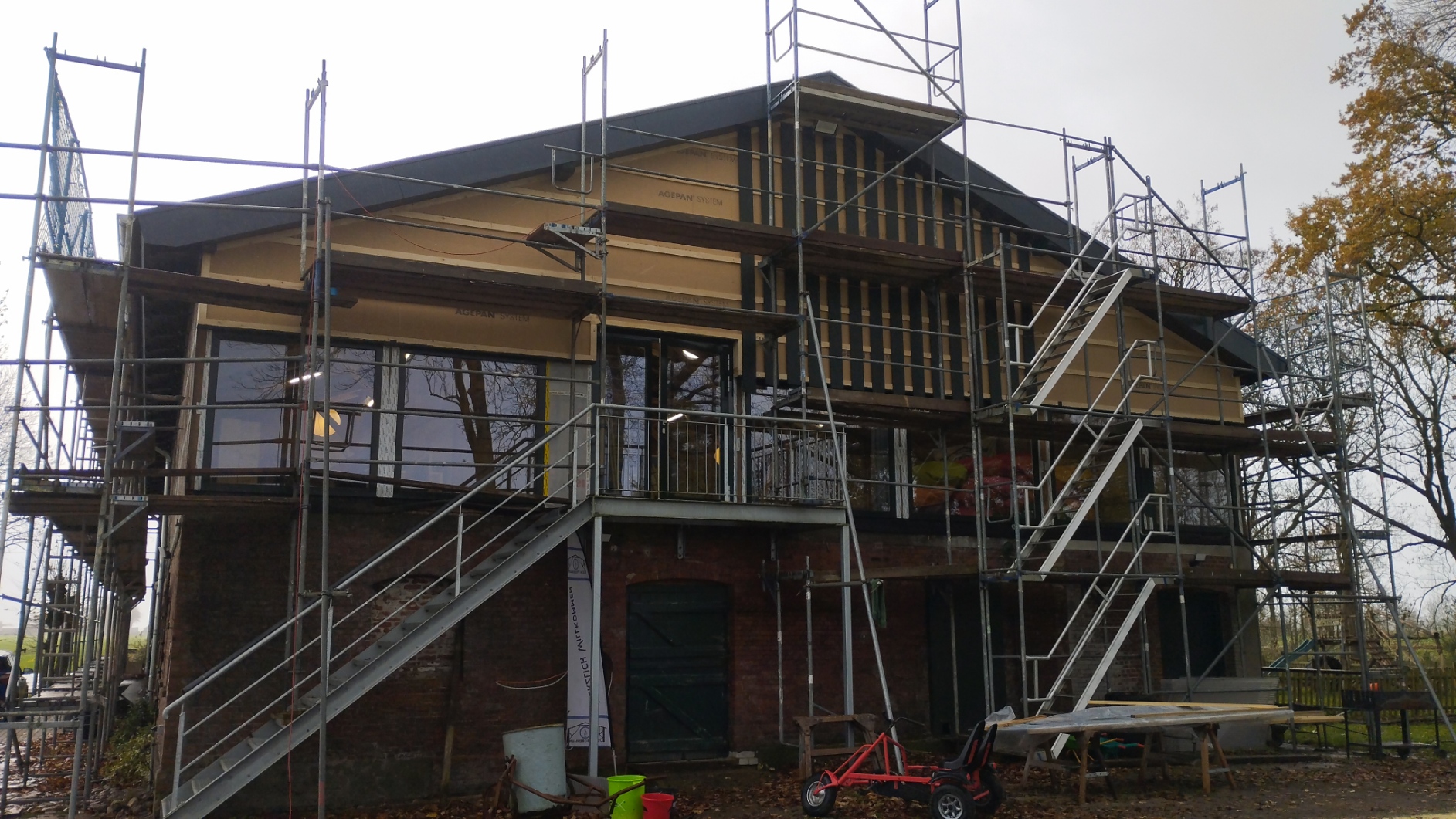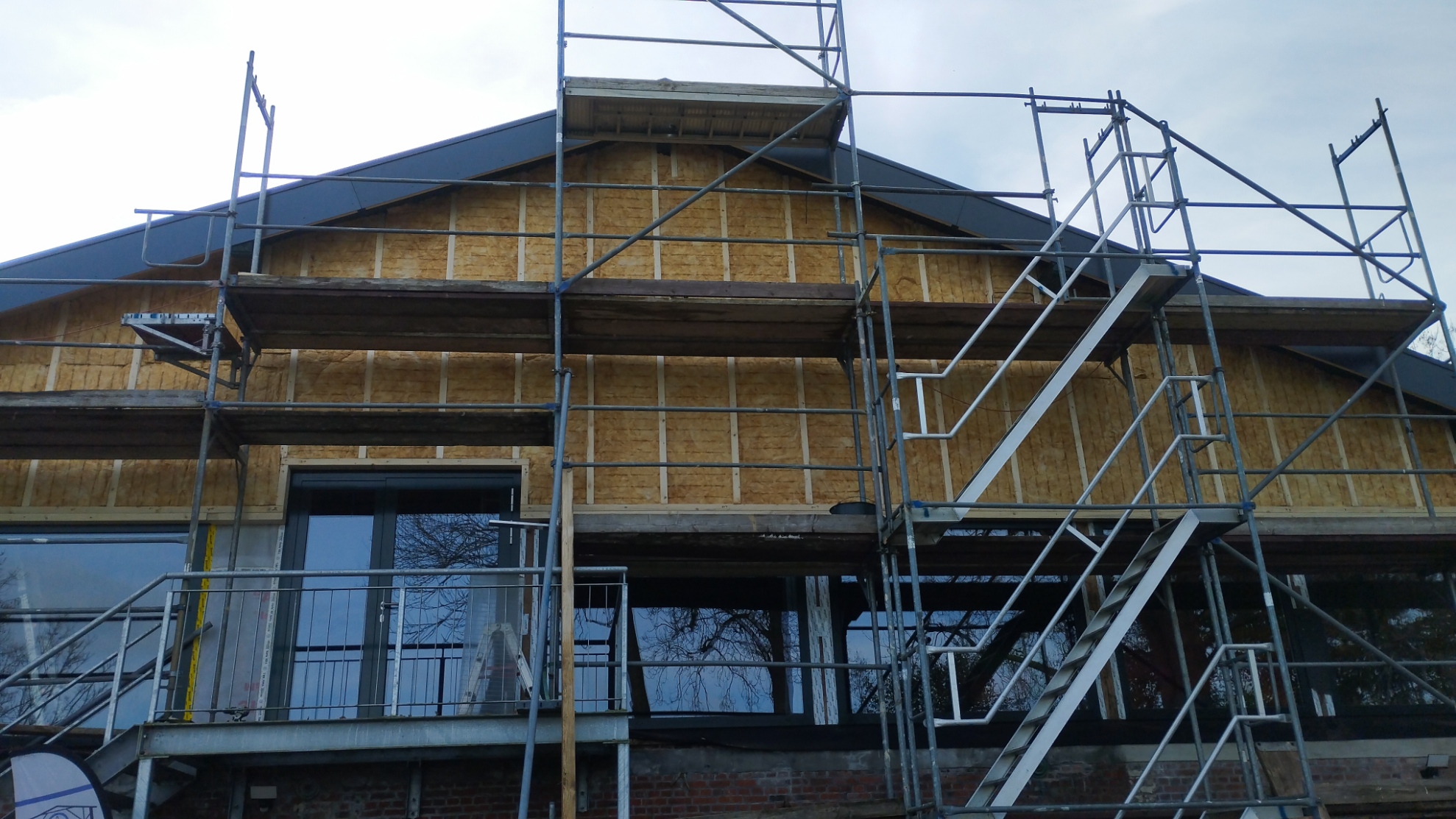 das erste gerüst ist aufgestellt und wir freuen uns nun auf die ersten, größeren arbeiten: der einbau der fensterfront und die energetische optimierung des giebels.